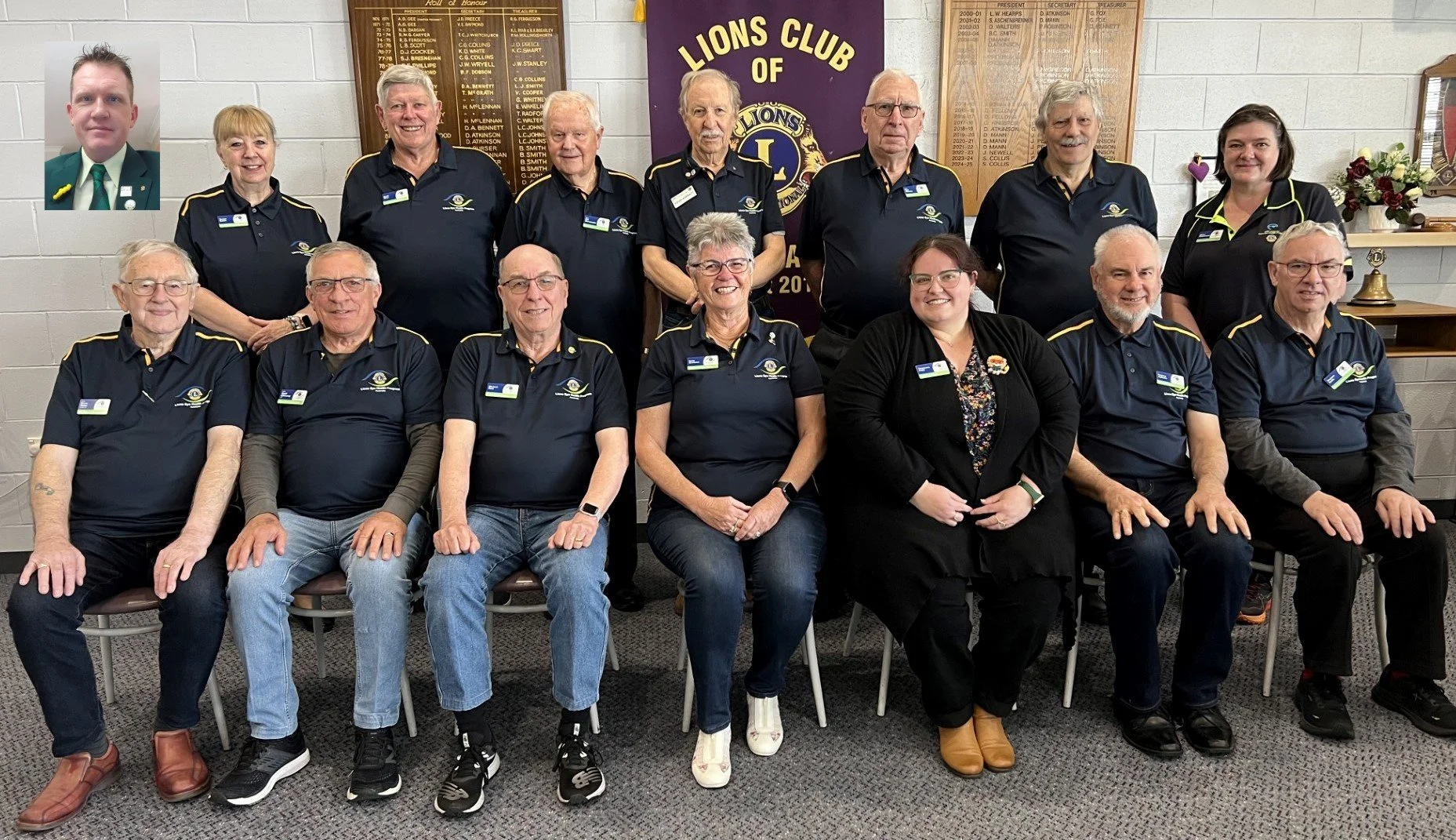 (Inset) PDG Jon Copson. (Back Row) Susan Eyton, Geoff Moor, PDG Bill Duncanson, Kevin Barratt, Max Holmes, Rob Winter, Allison Kazenwadel.