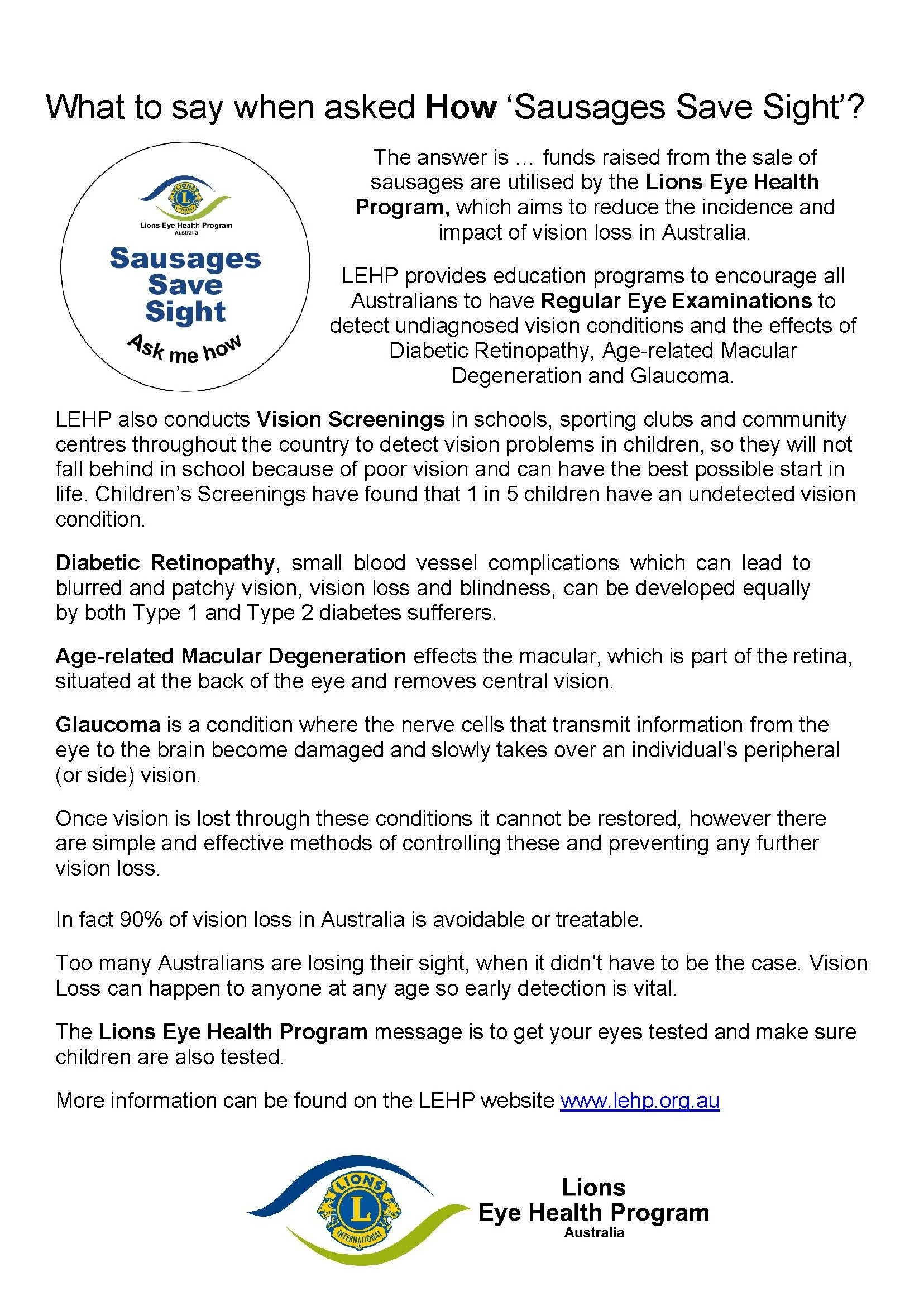 Profits from an upcoming BBQ being run by your Club, if donated to LEHP, will contribute towards education programs to encourage all Australians to have Regular Eye Examinations to detect the effects of Diabetic Retinopathy, Age-related Macular Degeneration and Glaucoma.